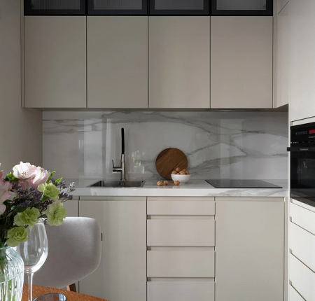 Установить шкафы до потолка, подобрать текстиль в одном стиле, отказаться от узоров и другие способы придать кухне лоск.