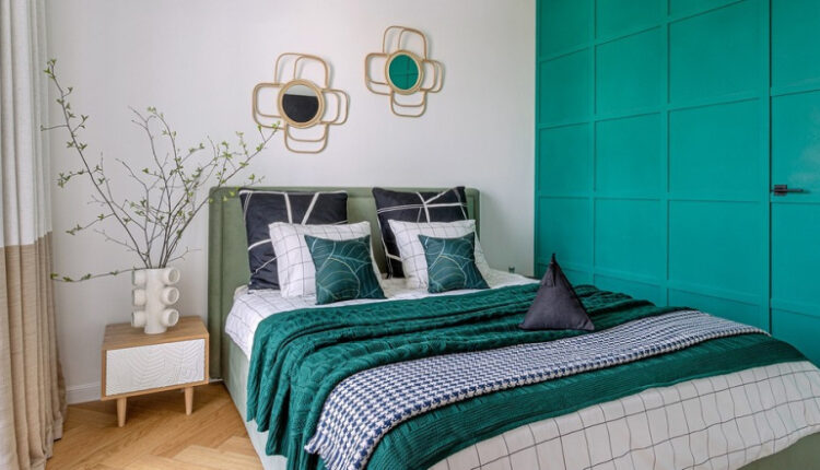 Яркий интерьер не всегда подразумевает сложную пеструю палитру. Это может быть один базовый и один насыщенный цвет. К примеру, здесь выбрали белоснежный и несколько разных оттенков зеленого: изумрудный для постельного белья, оливково-серый для изголовья кровати, темно-бирюзовый для двух акцентных стен. Все это дополняет контрастный черный.