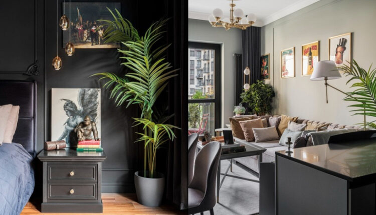 Для отделки стен и потолком дизайнер выбрал краску. В основном, это насыщенные темные оттенки. Прихожая и мастер-спальня в темных тонах.
