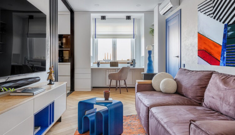 Когда заказчики сообщили, что им нужен «светлый, воздушный интерьер», предполагалась современная стилистика, которая органично вписалась бы в помещения железобетонной многоэтажки. Потребность в цвете проявилась по мере обсуждений. Желание ярких, экстравагантных оттенков изменило направление дизайна интерьера. Хозяевам квартиры очень нравится оттенок ультрамарин. Его активно использовали в отделке прихожей и акцентно в гостиной, даже электроустановочные изделия подобрали с синей окантовкой.