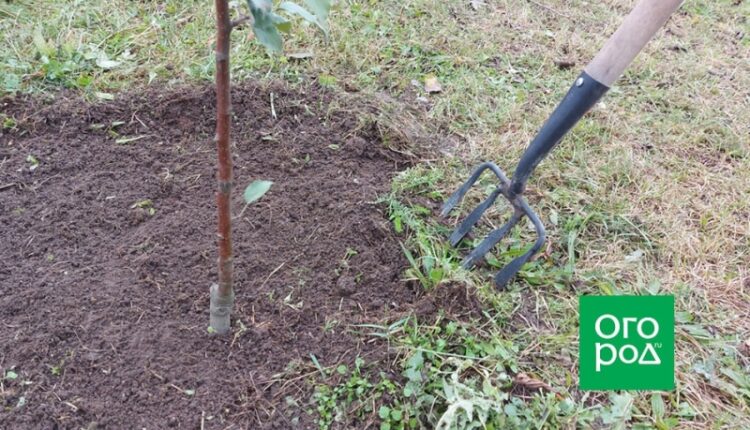 При рыхлении можно пользоваться вилами или тяпкой. Если вы используете для рыхления почвы вилы, располагайте их фронтально по отношению к дереву. А возле ствола можно рыхлить грунт только тяпкой на небольшую глубину, чтобы не повредить корни саженца.