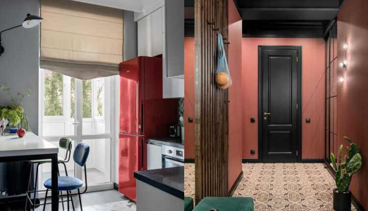 Что касается цветовых акцентов, в гостиной диван в изумрудной обивке, кровать выбрана в терракотовом цвете. На кухне на фоне белого гарнитура обращает на себя внимание красный холодильник.