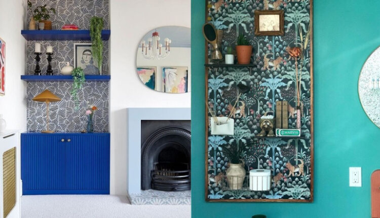 Подобные ниши часто обустраивают на манер книжных шкафов устанавливают открытые полки сверху и комод снизу. Здесь поступили так же, выбрав насыщенный синий оттенок. Его глубину и яркость подчеркивают обои, которые поклеили на «заднюю стенку» импровизированного шкафа. Их абстрактный хаотичный рисунок приковывает взгляд и сам по себе становится декоративным элементом. На полках расставили растения, аксессуары и вот это уже не ниша, которую сложно обыграть, а настоящий интерьерный акцент.