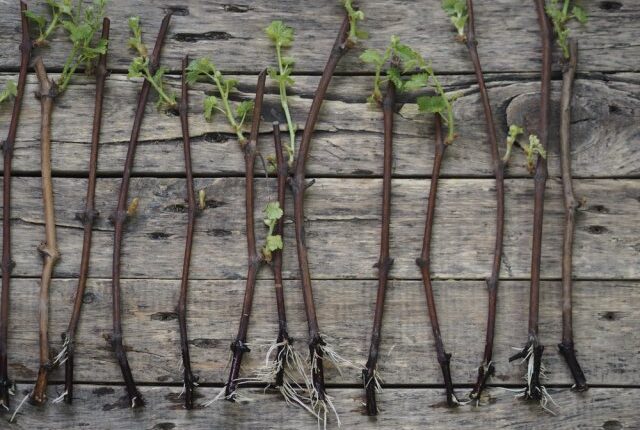 С наступлением весны, в феврале-марте, чубуки извлекают из хранилища и обрезают так, чтобы на каждом оказалось 3-5 почек. Затем погружают на 2/3 в воду с добавлением стимулятора корнеобразования (Корневин, КорнеСтим) и на время оставляют. После появления корешков длиной до 2 см черенки укореняют в небольших емкостях и доращивают, внимательно следя за влажностью почвы. В случае с виноградом молодые растения лучше недолить, чем перелить, т.к. их корни чувствительны к избытку влаги.