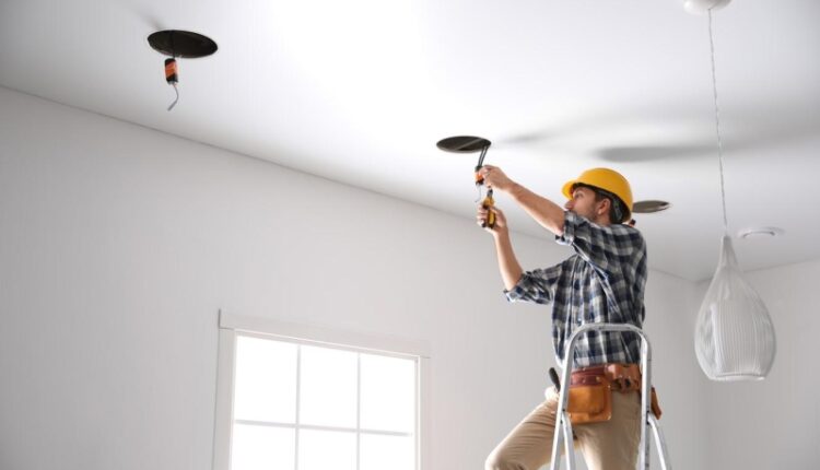 - Потолок размечают, отмечая на черновом покрытии (которое затем скроет натяжное полотно) место под будущий светильник;
