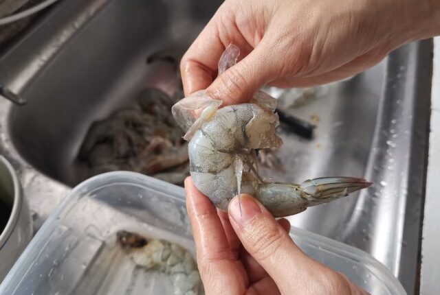 Очистка креветок начинается с головы. Ее аккуратно отделяют от всей остальной части ракообразного легким круговым движением руки. После этого так же аккуратно поддевают панцирь в районе «ножек» и тянут за «хвостик».