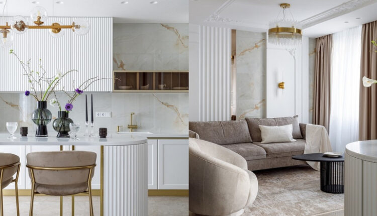 Было решено использовать в отделке решения в духе неоклассики и ар-деко, но обставить квартиру современной мебелью. Такой концепции соответствовало просторное помещение с лепным декором, мягкими контрастами, крупными симметричными предметами. Золото и мрамор подчеркнули уровень роскоши, двери скрытого монтажа и глухие шкафы добавили лаконизма. Отделка «перетекает» из одного помещения в другое, читаются общие принципы и приемы и небольшая квартира выглядит единым целым.