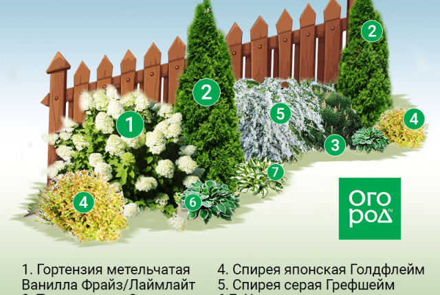 Эта композиция из декоративно-цветущих кустарников, разных видов хвойных и пестролистных хост будет отлично смотреться на солнечной или полутенистой стороне участка. Благодаря выбору неприхотливых растений (метельчатая гортензия, два вида спиреи, туи и хосты) она не потребует сложного ухода, при этом будет радовать декоративностью в течение всего сезона.