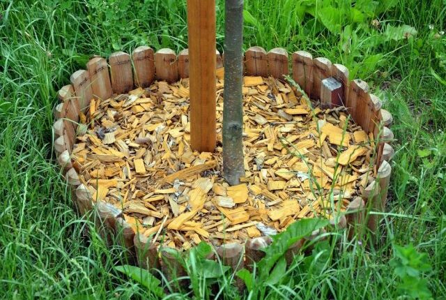 Щепу лучше всего использовать для деревьев, кустарников и крупных многолетников. Нужно стараться, чтобы такая мульча не касалась ствола, иначе возрастет риск образования гнили и появления вредителей.