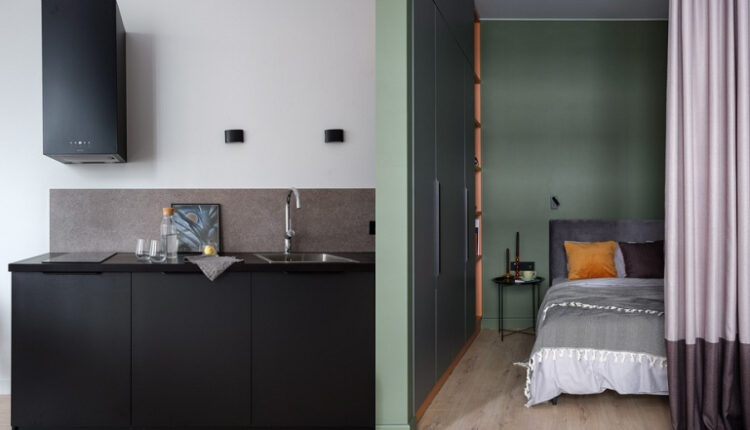 Дизайнер сделала ставку на качественные и долговечные материалы. Обычно в квартирах под сдачу поступают иначе, но тут преследовали другую цель. Тем не менее в бюджет нужно было уложиться. Для стен выбрали краску. Кухня и гостиная окрашены в нейтральный серый цвет. Прихожая и спальня в глубокий зеленый. Это позволило сделать пространство интереснее, а еще, как ни странно, расширить эти маленькие помещения. Глубокие цвета дают именно такой эффект.