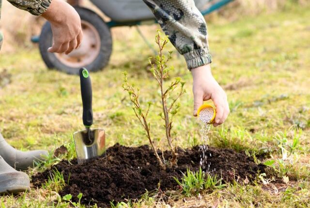Удобрения равномерно рассыпают вокруг куста, распределяя по проекции кроны, после чего заделывают в грунт.