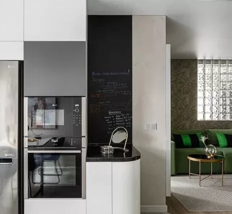 Этот отчасти декоративный прием на деле очень полезен любителям кулинарии. На участке стены, выкрашенном грифельной краской, можно записывать любимые рецепты, дополнять их красивыми картинками еды, составлять список продуктов перед походом в магазин или придумывать меню на неделю. Например, в этом проекте под такую стену для записей отдали небольшое пространство рядом с гарнитуром. Как вариант, таким образом можно оформить кухонный фартук или окрасить небольшой участок над столом.