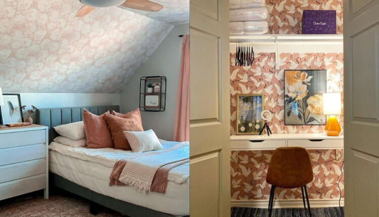 Эта комната необычная в ней хозяева совместили гардеробную и мини-кабинет. Решение функциональное, если работать из дома нужно только иногда и выделять под эту зону отдельное место не хочется. Но главная изюминка комнаты-ниши акцентные обои. Они превращают утилитарное помещение в модное место. А при раскрытых дверях так и приглашают войти в комнату, похожую на шкатулку с секретом. Активный крупный принт расширяет пространство. Однако если вдруг такой рисунок надоест, отделку несложно заменить «самоклейки» легко снимаются.