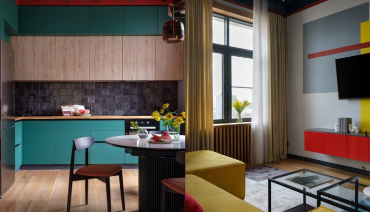Целью дизайнера и хозяев было создание яркого интерьера. Для этого удобнее всего работать с краской. Так поступили и в этом случае. Стены и потолки окрашены. На кухне светло-серые стены и вишневый потолок. Эти цвета выбрали в поддержку изумрудному кухонному гарнитуру, именно такой хотели заказчики.