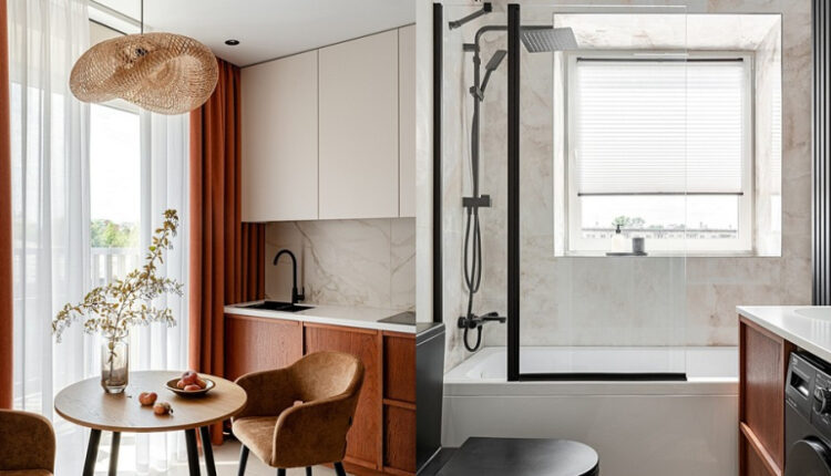 Заказчице нравится стиль джапанди, для которого характерно детальное продумывание разнообразных систем хранения. Эта квартира-студия пример такого подхода к организации пространства. Лаконичная кухонная мебель со встроенной бытовой техникой обладает достаточным функционалом для запасов продуктов и приготовления пищи. В высоком шкафу в прихожей есть отделение для хозяйственных предметов. Дополнительные места для вещей в комодной части под ТВ-зоной. Из двух колористических концепций хозяйка квартиры выбрала более яркую. Так, мебель с отделкой из тонированного шпона дуба и портьеры терракотового цвета стали акцентными на фоне нейтральных стен, а соломенная люстра над столом добавила балийского настроения.