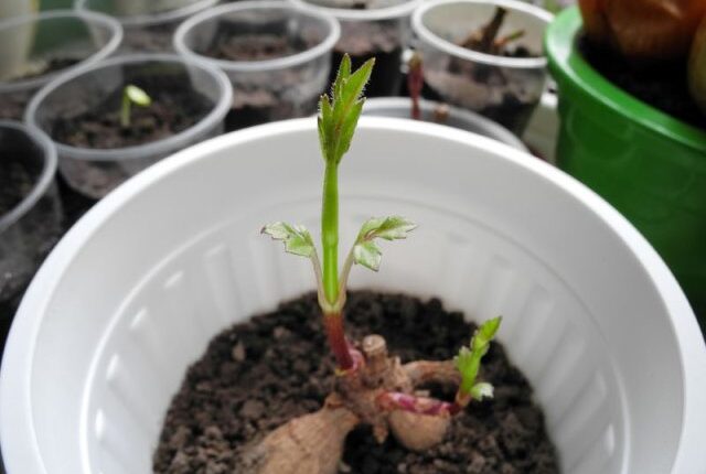 - наполните емкости подготовленной почвой и поместите в них клубни, не заглубляя корневую шейку, она должна находиться над поверхностью грунта. Почву вокруг клубня уплотните и аккуратно полейте;
