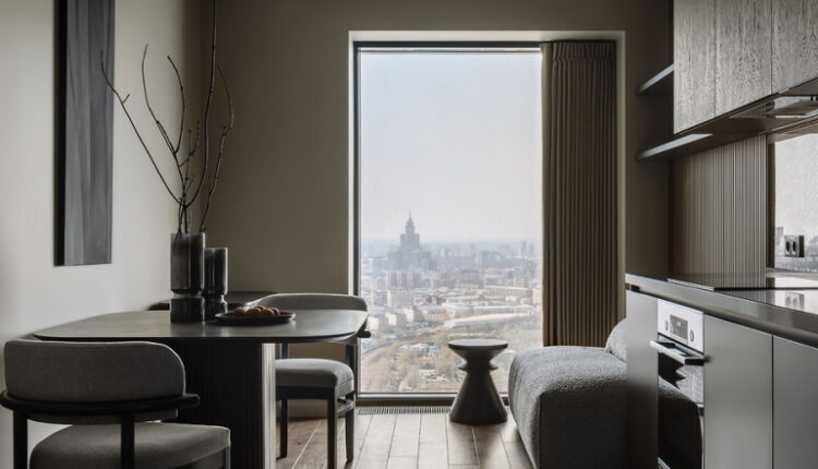 Интерьер не спорит с архитектурой жилого комплекса и не отвлекает от головокружительных панорамных видов, открывающихся с высоты пятидесятого этажа.