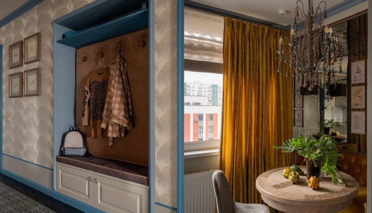 При выборе отделочных материалов ориентировались на заданную концепцию. В квартире активно использовали обои с различными принтами, преобладают растительные мотивы. В основе же окрашенные стены. Цвета не боялись. В коридоре в качестве акцентного использован голубой, в него окрашены плинтусы, карнизы, молдинги и межкомнатные двери, а также встроенный шкаф. В спальне девушки преобладает зеленый цвет в разных оттенках от более приглушенного до активного с примесью желтого.