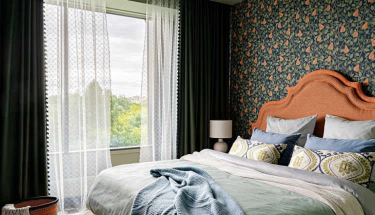 Зеленые шторы в интерьере спальни защищают от яркого света и помогают расслабиться.